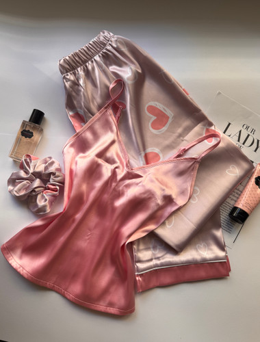 ست لباس خواب راحتی شلوار و تاپ و اسکرانچی ساتن